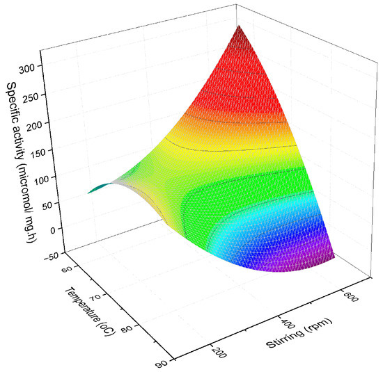 The experimental data obtained for the temperature, stirring speed, and specific activity (shown in the Figure 5) were fitted using a second-order model. Equation (3) represents the quadratic model, where X is the temperature in Celsius degrees, Y is the stirring speed measured in rpm, and Z is the specific activity in micromol mg−1 h−1: