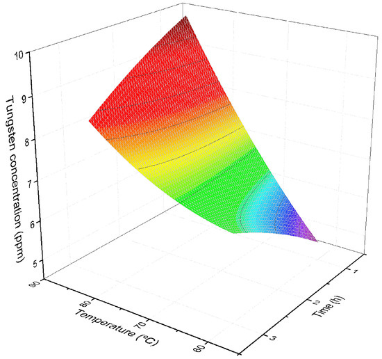On the other hand, for the case studied of temperature, time, and tungsten concentration (shown in Figure 6) a second-order model was also applied to approach the experimental data. In this context, the nonlinear fitted surface is given for Equation (4):
