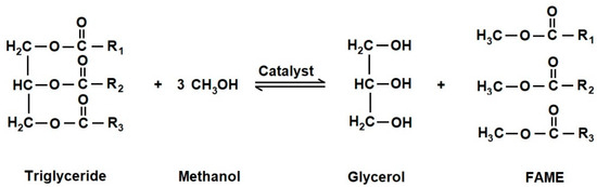 Transesterification of triglycerides with methanol.