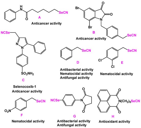 5,7-Dibromo-N-(4′-selenocyanatobutyl)isatin (B, Figure 1) exhibits in vitro cytotoxicity against breast cancer cells and is superior in activity to its thiocyanate analogue [51]. Selenocoxib-1 (C, Figure 1) inhibits the development prostate cancer cells [52]. Benzyl selenocyanate (D, Figure 1) shows antimicrobial and nematocidal activities almost one-hundred times higher than that of the reference drug oxacillin; its analogs E and F (Figure 1) exhibit high nematicidal activity [53]. Compound G (Figure 1) shows high antimicrobial and antifungal activities [54].