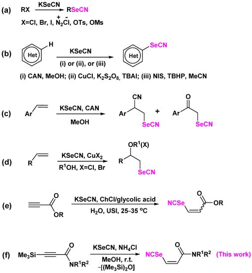 We developed an efficient approach to a novel family of (Z)-3-amino-3-oxo-1-propenyl selenocyanates based on the reaction of potassium selenocyanate with 3-trimethylsilyl-2-propynamides in the presence of ammonium chloride in methanol (Scheme 1f). This approach is superior to the known methods regarding efficiency and selectivity, high yields, mild reaction conditions (room temperature), the use of cheap and available reagent such as ammonium chloride, and green solvent such as methanol.