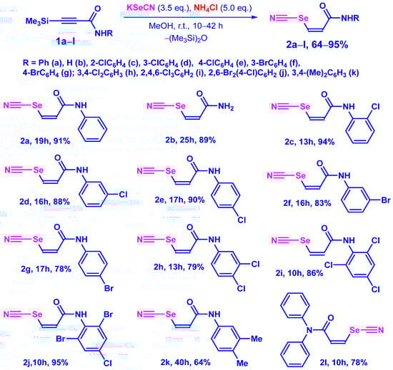 Synthesis of selenocyanates 2a–l by the reaction of 3-trimethylsilyl-2-propynamide 1a–l with KSeCN in the presence of NH4Cl.
