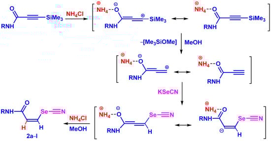 Besides the activation of the triple bond, ammonium chloride played a role of a proton donor to intermediate carbanion. Certain weak acidity of the reaction media is very important, which should be suitable for the addition of selenocyanate anion to the triple bond as well as for the protonation of intermediate carbanion, stabilized by the carbonyl group (Scheme 3).