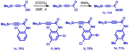 Starting 3-trimethylsilyl-2-propynamides 1a−l were prepared from 3-trimethylsilylpropiolic acid and amines by the methods which were previously developed in this institute [66,70]. Trimethylsilyl-2-propynamides 1c and 1i−k are new compounds and were prepared for the first time (Scheme 4).