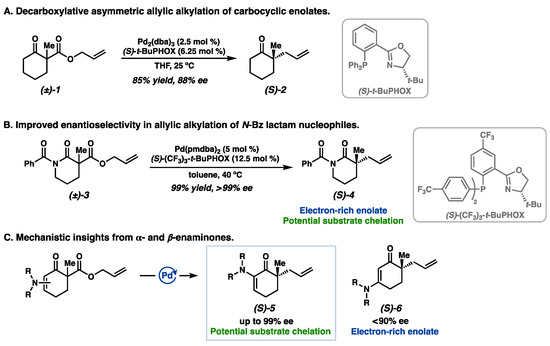 (A) The decarboxylative asymmetric allylic alkylation of cyclic ketone nucleophiles. (B) Allylic alkylation of N-benzoyl lactams. (C) Mechanistic insights from a- and b-enaminone substrate classes.