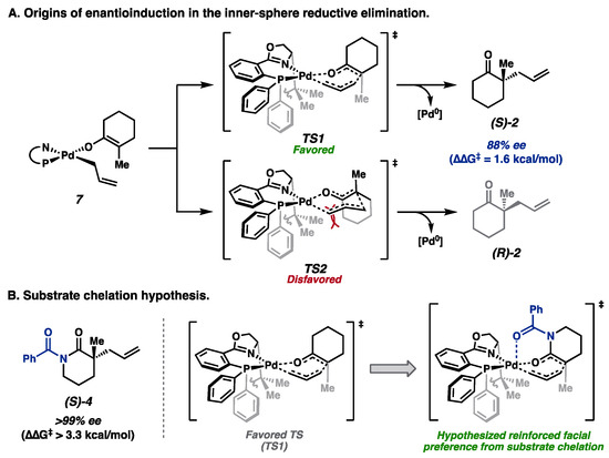(A) Enantioinduction via inner-sphere reductive elimination. (B) Initial hypothesis for enhanced enantioenrichment of N-benzoyl lactam substrates as compared to cyclohexanones.