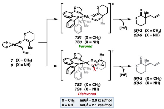 Beginning with enolate 7, derived from carbocyclic substrate 1, we find a 2.0 kcal/mol preference for TS1 over TS2 at the revDOD-PBEP86-NL/def2-TZVPP/SMD(PhMe)//r2SCAN-D4/def2-TZVP[Pd], def2-SVP level of theory—in accord with our prior studies (Figure 3) [7]. Maintaining a similar steric profile while perturbing enolate electronics with N–H lactam-derived enolate 8 did not significantly alter ΔΔG‡. Accounting for distribution across all conformers, enantiomeric excesses of 89% and 90% are computed, respectively (experimentally, the corresponding N–H lactam is not compatible in the transformation).