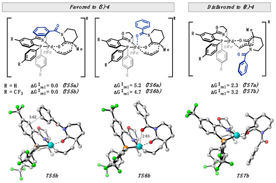 We then explored the effect of N-substitution on the relative free energies. N-benzoyl substitution affords two low-energy transition states from the favored Si face—one conformer with the flanking carbonyl of the benzoyl group oriented away from (TS5) and another toward (TS6) the metal center (Figure 4). TS6 is reminiscent of our chelating heteroatom hypothesis (Figure 2B). However, TS5 is computed to be favored over TS6 by 5.2 and 4.7 kcal/mol with (S)-t-BuPHOX and (S)-(CF3)3-t-BuPHOX ligands, respectively. With regard to enantioselectivity, TS5 is favored over the lowest energy Si face transition states (TS7) by 2.3 and 3.2 kcal/mol with the (S)-t-BuPHOX and (S)-(CF3)3-t-BuPHOX ligands, respectively. Computed enantiomeric excesses of 95% and 99% are found when accounting for all transition state conformers. The additional increase in ΔΔG‡ of 0.9 kcal/mol with incorporation of p-CF3 groups may arise from increasing favorable electrostatic interactions between the benzoyl and PHOX ligand arene quadrupoles in TS5b. We note the electron-poor (S)-(CF3)3-t-BuPHOX ligand is also crucial in promoting the inner-sphere mechanism discussed herein over less selective outer-sphere pathways.