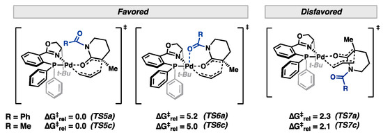 In lieu of secondary substrate chelation to Pd, we posit that the success of the benzoyl group lies in its ability to adopt a parallel orientation to the open face of the PHOX backbone in TS5. However, the tert-butyl group occupies this site in the Si transition state (TS7). Hence, this low-energy orientation is not accessible, and a large energetic penalty is incurred in C–C bond formation from the Si face. The results presented herein suggest that the improved enantioselectivity observed in the N-Bz class of substrates is noncovalent in nature. While no evidence of secondary substrate chelation is found for N-Bz lactams, such interactions may prevail in other substrate classes. The detailed investigation of these systems will be reported in due course.