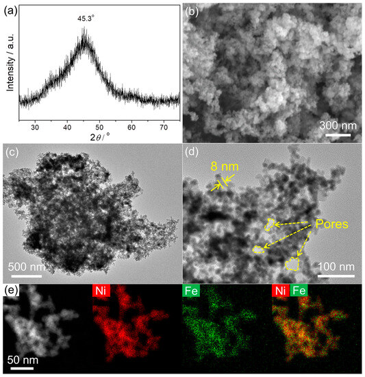 (a) XRD pattern, (b) SEM image, (c) TEM image, (d) HRTEM image (the arrows p pores), (e) HAADF-STEM and elemental mapping images of the NiFe-21 nanoaggregates.