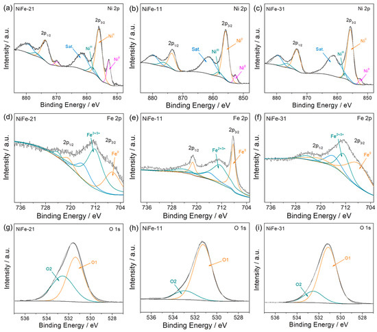 (a–c) High-resolution Ni 2p XPS spectra, (d–f) Fe 2p XPS spectra, and (g–i) O 1s XPS spectra of NiFe-21, NiFe-11, and NiFe-31, respectively.