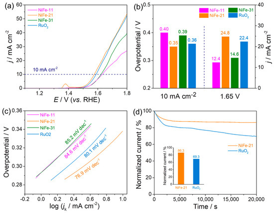 To evaluate the electrocatalytic activities of as-synthesized NiFe samples, the electrochemically active surface area (ECSA) measured by double-layer capacitance (Cdl) was greatly important. Based on the CV plots, the Cdl of the NiFe-21 nanoaggregates was 0.37 mF cm−2 (Figure S6a,b), which is higher than that of NiFe-11 (0.19 mF cm−2, Figure S6c,d) and NiFe-31 (0.24 mF cm−2, Figure S6e,f). The higher Cdl value of the NiFe-21 nanoaggregates suggests a larger catalytically relevant surface area, implying superior electrochemical performance. This may have been due to the collapse of the 3D interconnected structure when the Fe content was low, resulting in a decrease in active sites, whereas the higher Fe content may have led to a reduction in real active sites on the Ni species, thus leading to poor activity. The OER performance of the NiFe-21 nanoaggregates and other contrast samples was initially evaluated by linear sweep voltammetry (LSV) tests in O2-saturated 1 M KOH solution. Figure 4a shows the typical OER polarization curves of the three as-synthesized NiFe nanocatalysts and commercial RuO2 catalysts. Obviously, only the NiFe-21 catalyst had an anodic peak from 1.3 to 1.5 V (vs. RHE), compared with the NiFe-11, NiFe-31, and RuO2 catalysts, which was due to the oxidation of Ni. The combined action of Ni and NiO may have resulted in the H−O bond being easier to dissociate and the active species oxidizing more lightly on the NiFe-21 nanoaggregates under the same conditions, thereby promoting OER activity. The potential at the current density of 10 mA cm−2 is a significant experimental parameter for OER. As summarized in Figure 4b, the NiFe-21 nanoaggregates displayed the lowest overpotential of 0.35 V in comparison with that of NiFe-11 (0.40 V), NiFe-31 (0.39 V), and RuO2 (0.36 V) at the current density of 10 mA cm−2, as well as other reported catalysts (Table S2). What is more, the NiFe-21 nanoaggregates showed a higher current density than that of other compared catalysts at a potential of 1.65 V (vs. RHE), indicating superior activity of the NiFe-21 nanoaggregates towards OER. The corresponding Tafel slope is the most essential parameter for estimating the reaction kinetics [8,41].