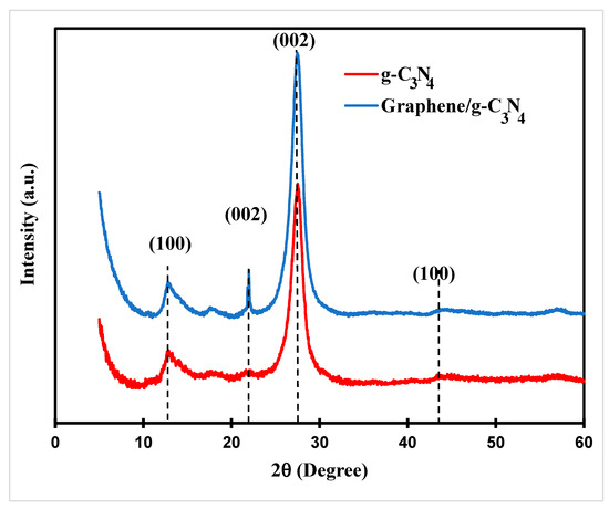 The XRD patterns of the synthesized photocatalysts, i.e., pure g-C3N4 and graphene/g-C3N4 composites, are shown in Figure 1. There are two peaks of reflections for both materials. The peaks are most pronounced and centered around 13.1° and 27.4°, indicating very clearly that the graphitic-type crystal structure of g-C3N4 was formed [50,51]. The low-intensity peak appearing at 2θ = 13.1° can be indexed to the (100) plane and corresponds to a structural rearrangement pattern between the tri-s-triazine (heptazine) continuous planes with an interlayer distance of 0.676 nm [52,53]. Moreover, the strong peak at 2θ = 27.4° is attributed to a (002) plane, reflecting the periodic stacking of the conjugated aromatic structure with an interlayer distance of 0.33 nm [54,55,56]. Also, another low-intensity diffraction peak is observed at 2θ = 21.8° with a (002) plane, probably due to the low amount of graphene oxide remaining after the reduction of GO to graphene. Interestingly, Sengupta et al. [57] also reported the occurrence of two characteristic peaks corresponding to (002) and (100) planes in their investigation of the effect of temperature on the reduction of graphene oxide to graphene. These findings are comparable with the XRD data reported in the present work; therefore, it can be concluded that the photocatalysts under study were well synthesized and had a high structural crystallinity corresponding to pure g-C3N4 and graphene/g-C3N4. The presence of two diffraction peaks always existed in graphene/g-C3N4 with 2θ = 13.1° and 2θ = 27.4° implying a strong interaction between graphene and g-C3N4 [58].