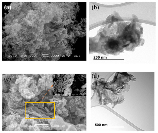 Figure 2 depicts the SEM and TEM images of g-C3N4 and graphene/g-C3N4 photocatalysts. The SEM analysis of the g-C3N4 material revealed a typical flaky and ultrafine nanosheet structure (see Figure 2a). These nanosheets are curled to reduce the surface tension. This particular property is identical to the construction of the exfoliated carbon scrolls during graphite peeling [59,60]. The graphene/g-C3N4 composite exhibited a sandwich structure, which could explain the very close contact between the g-C3N4 and graphene (Figure 2b) [50,61]. Also, in the enlarged image of the targeted location (Figure 2b inset), it is clearly seen that the g-C3N4 lamellas are dispersed on the graphene surface, which may not only minimize the aggregation of g-C3N4 but may also increase the active sites of graphene/g-C3N4 for the photocatalytic reaction [58]. As for the TEM analysis, g-C3N4 exhibited a typical small, thin and flat irregular two-dimensional shape (see Figure 2c), while graphene/g-C3N4 showed no free graphene sheets (see Figure 2d) apart from the g-C3N4 sheets. This may suggest that the in situ growth method successfully integrated g-C3N4 with graphene.