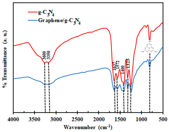 Figure 3 depicts the FTIR spectra belonging to g-C3N4 and graphene/g-C3N4 materials. In the case of g-C3N4 material, a broad band around 3600 cm−1 is observed and assigned to N–H stretching vibrations of non-condensed amino groups in the structure of g-C3N4 [54,62]. Moreover, the broad, strong peak around 3350 cm−1 was attributed to hydroxyl groups (–OH) and physically adsorbed water [58]. The strong peaks at 1235, 1325, 1403, 1572 and 1637 cm−1 correspond to the typical stretching vibrations of (C=N) and (C–N) [52]. In addition, the band around 812 cm−1 corresponds to the bending modes of the tri-s-triazine backbone units [52]. For graphene/g-C3N4, the peak at 3350 cm−1 (–OH) flattened slightly, thus signifying a partial removal of hydroxyl groups (–OH) [59]. Since the synthesis of graphene/g-C3N4 involves an in situ thermal reduction of the graphene oxide, the disappearance of characteristic absorption peaks belonging to graphene oxide may indicate the effective GO reduction, as previously reported [57]. The absorption peak at 1734 cm−1 corresponding to the stretching vibrations of carbonyl groups (–C=O–) of GO was not observed. However, a weak peak at 1637 cm−1 attributed to an epoxy group (–CO–) known by its high binding energy occurred, thus demonstrating that it is difficult to remove all the epoxy in graphene oxide following the thermal reduction [58]. The weak intensity of the band at 1403 cm−1 was attributed to a partial removal of the carboxylic groups (–COOH) [57]. Furthermore, the peak at 1325 cm−1 is responsible for the C=C backbone vibration in graphene. In summary, it can be concluded that the characteristic peaks of g-C3N4 did not change after graphene deposition.