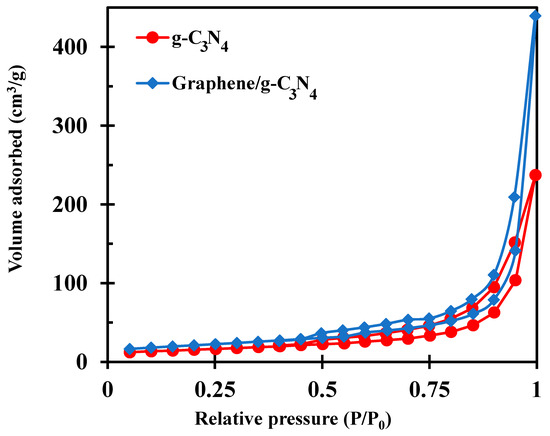 Textural properties of the g-C3N4 and graphene/g-C3N4 materials were investigated using N2 adsorption–desorption volumetric analysis. As illustrated in Figure 4, the obtained isotherms were attributed to the type IV with H3 hysteresis loop according to the IUPAC classification, thus indicating the occurrence of a mesoporous structure. The BET-specific surface areas of g-C3N4 and graphene/g-C3N4 were 54.4 and 74.8 m2/g, respectively. The occurrence of mesopores was corroborated by the pore diameters evaluated to be 3.4 and 4.9 nm for g-C3N4 and graphene/g-C3N4, respectively. The pore volumes reached 0.37 and 0.68 cm3/g for g-C3N4 and graphene/g-C3N4, respectively.