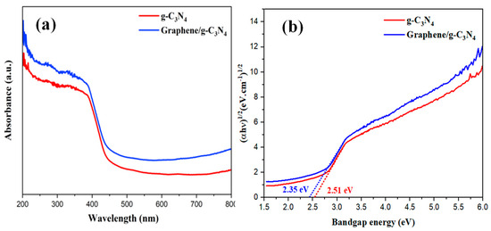 Given that the value of n of graphitic carbon nitride is 4, the Eg of photocatalysts could be determined by the tangent lines versus (hν) [66]. Therefore, the obtained results indicated that the band gap energies of g-C3N4 and graphene/g-C3N4 were 2.51 and 2.35 eV, respectively. The band gap of g-C3N4 compares relatively well with that found in the literature [12]. These findings confirm that the combination of g-C3N4 semiconductor with graphene can decrease the band gap energy of the composite material and significantly increase the absorption in the visible light region, which could promote higher photocatalytic activity.