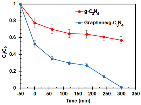 To assess the adsorption and photocatalytic performances, the removal of aqueous atrazine was carried out under dark and visible light irradiation in the presence of the photocatalysts. The obtained results indicated that the equilibrium was reached within ca. 20 min. Performances of g-C3N4 and graphene/g-C3N4 were investigated under similar conditions, as presented in Figure 7. Noticeably, the adsorption under dark conditions allowed the removal of ca. 25 and 50% of atrazine in the presence of g-C3N4 and graphene/g-C3N4, respectively. The subsequent photocatalytic degradation performed under visible light allowed to reach ca. 50 and 100% removal of atrazine within 5 h of reaction over g-C3N4 and graphene/g-C3N4, respectively. Clearly, the composite containing graphene largely outperformed the pristine g-C3N4. This improved photocatalytic activity under visible light may be attributed to the important role of graphene in the enhanced photoinduced electron conduction through the graphene sheets. Additionally, its two-dimensional, planar π-conjugation structure gives graphene excellent electron conductivity, allowing for rapid transport that results in efficient charge separation [67].