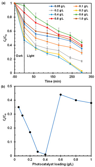 The effect of photocatalyst loading on the photodegradation of atrazine is presented in Figure 8a. The results showed that the photocatalytic conversion of atrazine ranged from 54% to 100% within 5 h of the reaction when the photocatalyst loading was increased from 0.05 to 0.4 g/L. The effect is due to the increase in the amount of photocatalyst, which increases the number of active sites of graphene/g-C3N4 photocatalyst. Interestingly, it was found that the loading of 0.4 g/L was optimum, leading to the best performances (see Figure 8b). Indeed, the photocatalytic degradation of atrazine decreased when the photocatalyst loadings were set beyond the optimum loading of 0.4 g/L, i.e., 0.6, 0.8 and 1 g/L. This effect may be attributed to the fact that the degradation reaction was hampered by the shielding effect occurring in the reactor when high photocatalyst loadings are used. Indeed, under these conditions, agglomeration of the photocatalyst particles may occur, thus generating an obstacle preventing light from reaching the surface of the photocatalyst. Therefore, an optimal photocatalyst loading is likely able to generate more hydroxyl radicals and superoxide reactive species, leading to better photocatalytic degradation of atrazine than high loadings [68,69]. Sharma et al. also noted that the excessive photocatalyst loadings during the reaction led to a decrease in photocatalytic activity [70].