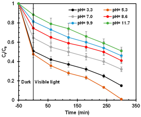 pH is among the most important factors affecting the efficiency of many chemical and biological processes [71]. It also plays an important role in the production of hydroxyl radicals (OH•), which have been shown to oxidize many different recalcitrant organic pollutants into mineral end products [72]. The photocatalytic reaction medium pH referring to a specific concentration of protons (H+) or hydroxyl (OH−) ions in aqueous solutions can have an impact on the protonation or deprotonation of pollutants as well as photocatalysts surfaces, thus influencing the ability of the photocatalyst to adsorb the reactants, its activity, and the course of the reaction [73]. Therefore, the effect of pH on the degradation of atrazine in the presence of graphene/g-C3N4 composite was investigated. The original atrazine solution had a pH of 5.33, and the addition of hydrochloric acid and sodium hydroxide in solution regulated the other initial pH values (3.3, 2.5, 7.0, 8.6, 9.0 and 11.7). As shown in Figure 9, the conversion of atrazine decreased with increasing initial pH except for pH = 5.3, where there was no noticeable difference in the degradation of atrazine under acidic conditions. Rapid degradation occurred at low initial acidic pH at (pH = 3.3) and high at (pH = 5.3), where pH was the optimum, and where 85.2% and 100% of atrazine, respectively, was removed within 5 h of exposure time. Therefore, it can be concluded that acidic conditions are advantageous for the photocatalytic degradation of atrazine. Indeed, more H+ will bind to the surface of the graphene/g-C3N4 photocatalyst under acidic conditions, positively charging the surface. The single chloride atom of atrazine has an electron-withdrawing group and high electronegativity, allowing stronger adsorption by the photocatalyst. Xue et al. reported a BiOBr/UiO-66 composite which was very effective for the degradation of atrazine under visible light; they reported that this composite has the same reaction impact in view of the degradation with pH effect as the graphene/g-C3N4 composite. Their results show that the positively charged composite could enhance the electron transport on the surface of the photocatalyst and thus react with oxygen to produce a superoxide radical (O2•−). In addition to this advantage, the recombination of charge carriers (e−/h+) could be decreased, and thus, the electron reacts with the with O2 from the solution, obtaining (O2•−) and efficiently oxidizing atrazine in the presence of graphene/g-C3N4 [74].