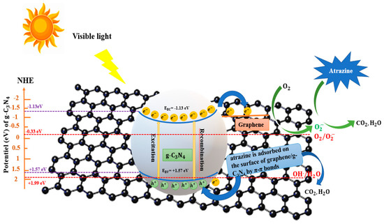 The heterogeneous photocatalysis allows the conversion of photonic energy (solar or artificial radiation) into chemical energy [75]. The photocatalyst (graphene/g-C3N4) absorbs visible light photon energy greater than or equal to its band gap energy. The electrons are excited to move from the valence band (BV) to the conduction band (BC), leading to the formation of electron–hole pairs (see Figure 10). The free charge carriers of the photocatalyst are positively charged holes (h+) in the valence band (BV) and electrons (e−) in the conduction band (BC). These charge carriers, the electron–hole pairs in the BC and BV, respectively reduce and oxidize the compounds adsorbed on the surface of the photocatalyst. However, the photogenerated electron–hole pairs have a very short lifetime of the order of 10−9 s, which means that the probability of the chemical reaction time of the photocatalyst with atrazine is very low. The rapid recombination strongly affects the photocatalytic activity. The mechanism of heterogeneous photocatalysis of a g-C3N4 deposition on graphene can be explained as follows: (1) increased absorption of visible light, (2) separation and transfer of photoinduced charge carriers to the surface of the photocatalyst, and (3) reaction between the charge carriers (e−/h+) and atrazine molecules. A schematic diagram of the mechanism of photodegradation of atrazine is shown in proposed in Figure 10). According to Du et al. [67], electrons can be directly excited from the valence band of graphene to the conduction band of g-C3N4. Indeed, graphene is a conductor that allows electrons to move freely. The energy of g-C3N4 in the conduction band is more negative than that of graphene. Therefore, photoinduced electrons can be transferred from the conduction band of g-C3N4 to graphene. The electrons of g-C3N4 can reduce the oxygen O2 present in the solution into active superoxide O2•− since the redox potential NHE (O2/O2•−) is −0.33 eV). These electron–hole interlayer transfers between g-C3N4 and graphene extend the lifetime of the charge carriers. The valence band energy of g-C3N4 is more positive than the valence band energy of graphene, but the valence band energy of g-C3N4 (+1.57 eV) is less positive than the potential of (•OH/H2O = +1.99 eV), which does not allow the EVB holes of g-C3N4 to oxidize H2O and produce OH• hydroxyls. The adsorbed atrazine on the surface of the photocatalyst decomposes by transferring electrons (e−) to the positive holes (h+) on the valence band of graphene/g-C3N4. These charge carriers trigger oxidation/reduction reactions that degrade the adsorbed contaminants (atrazine) and transform them into harmless products such as CO2, H2O, and other by-products such as inorganic acids. The equations of the photocatalytic reaction of atrazine over graphene/g-C3N4 are proposed together with the illustration of this mechanism (Figure 10), in agreement with the findings reported in the literature [50].
