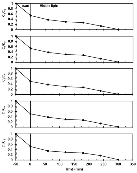 Stability and reusability are crucial for a heterogeneous photocatalyst. To assess the stability of the graphene/g-C3N4 photocatalyst in the photocatalytic degradation of atrazine, five reaction cycles were carried out under the optimum conditions of the above-mentioned reactions, i.e., photocatalyst loading of 0.4 g/L in contact with 10 mg/L atrazine solution, reaction duration 5 h and pH = 5.3, using the same photocatalyst batch. After each run, the photocatalyst was collected and rinsed several times with distilled water and dried for 24 h before the beginning of the next cycle. As depicted in Figure 11, it was found that the graphene/g-C3N4 composite, as designed, reveals stability and reusability after five cycles of recycling, as there was no significant loss of photocatalytic activity for atrazine degradation. It can be concluded that the graphene/g-C3N4 photocatalyst is of good quality as it maintains excellent stability and photocatalytic activity. Additionally, the conditions of its reuse require only a simple rinsing with pure water followed by drying, thus facilitating its long-lasting and efficient reuse.