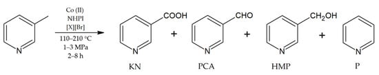 In Table 2, the composition of the products of the 3-picoline oxidation in the presence of the selected catalytic system Co(OAc)2/NHPI/[bmim][Br] under different conditions of pressure (1–3 MPa), temperature (110–210 °C), and time (2–8 h) is compared.