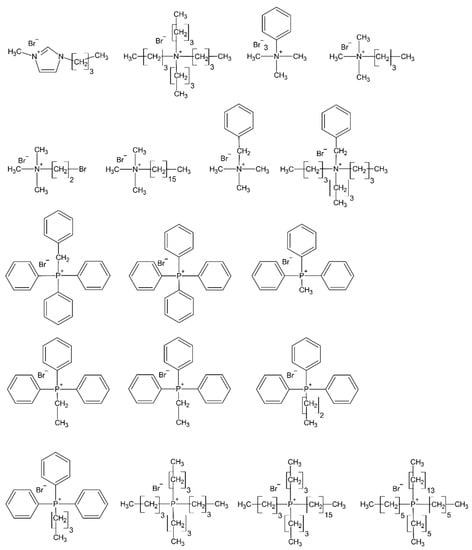 3-methylpyridine (Acros Organics, St. Louis, MO, USA, 99%), 4-methylpyridine (Acros Organics, 99%), 2-ethyl-5-methylpyridine (Sigma Aldrich, St. Louis, MO, USA, >96%), nicotinic acid (Acros Organics, 99.5%), cobalt(II) acetate tetrahydrate (Acros Organics, >98%), N-hydroksyftalimide (Acros Organics, 98%), sodium bromide (Sigma Aldrich, >99%), 1-butyl-3-methylimidazolium bromide (Sigma Aldrich, >97%), tetra-n-butylammonium bromide (Thermo Scientific, Waltham, MA, USA, >98%), trimethylphenylammonium tribromide (Sigma Aldrich, 97%), trimethylhexadecyl ammonium bromide (Thermo Scientific, >99%), trimethylbromoethylammonium bromide (Sigma Aldrich, 98%), trimethylbenzylammonium bromide (Acros Organics, 98%), benyzltriethylammonium bromide (Sigma Aldrich, 99%) tributylbenzylammonium bromide (Alfa Aesar, Haverhill, MA, USA, 99%), trimethyl-n-butylammonium bromide (Sigma Aldrich, 98%), tetraphenylphosphonium bromide (Alfa Aesar, >98%), tetra-n-butylphosphonium bromide (Thermo Scientific, 99%) tri-n-butyllhexadceylphosphonium bromide (Merck, Darmstadt, Germany, >96%), trihexyltetradecylphosphonium bromide (Sigma Aldrich, >95%), methyltriphenylphosphonium bromide (Acros Organics, 98%), ethyltriphenylphospfhonium bromide (Acros Organics, 99%), propyltriphenylphospfhonium bromide (Sigma Aldrich, 98%), n-butyltriphenylphospfhonium bromide (Thermo Scientific, 99%), benzyltriphenylphospfhonium bromide (Alfa Aesar, >98%), acetic acid (Chempur 99.5%), trifluoroacetic acid (Acros Organics, 98%), benzonitryle (Acros Organics, 99%), pyridine (Acros Organics, 99.8%), and 1,1,1,3,3,3-hexamethyldisilazane (Acros Organics, 98%) were used.