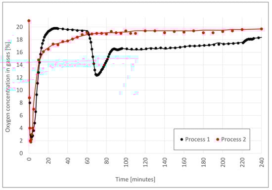 In Figure 3, the dependence of the oxygen concentration in off-gases on the duration of reactions carried out at 190 °C and 170–210 °C is compared.