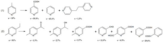 In point (1) in Figure 4, the composition of the production of 4-picoline oxidation is shown. The oxidation of 4-picoline led to 4-pyridine carboxylic acid obtained with a 55.5% selectivity and 18% conversion of raw material. Pyridine was obtained with a 43.1% selectivity and a dimer was observed as the main by-product. The presence of pyridine in the reaction products indicates a high degree of pyridine carboxylic acid decarboxylation caused by high temperature, pressure, and the active catalytic system. However, under these conditions, a low degree of raw material conversion was obtained.