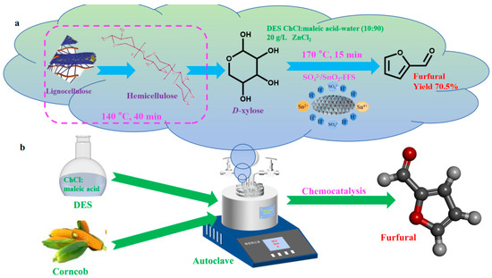 The process of catalytically converting the D-xylose solution obtained from the hydrolysis of corncob at 140 °C for 40 min into FAL using SO42−/SnO2-FFS in a DES-water system (a); a chemical strategy for synthesis of FAL from corncob with biochar-based heterogeneous chemocatalyst (b).
