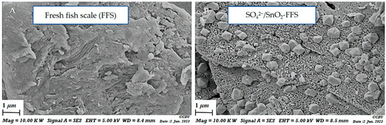 SEM image of FFS (A) and solid acid SO42−/SnO2-FFS (B).