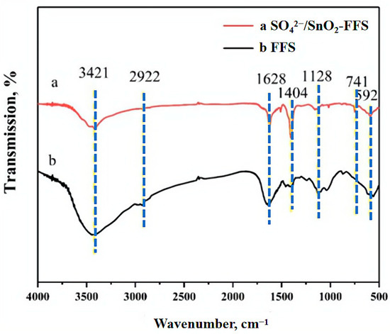 Fourier transform infrared spectroscopy (FT-IR) images of chemocatalyst SO42−/SnO2-FFS and FFS. FT-IR was conducted by using Nicolet IS50 (Thermo Scientific, Waltham, MA, USA) in the range of 4000–500 cm−1.