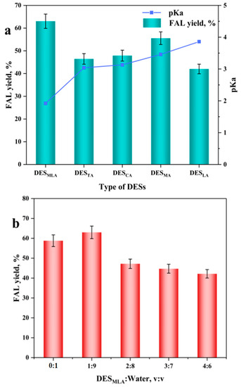 Effect of different DES type and the pKa value of different organic acid in DES on the FAL yield in DES–water (20:80, v/v) system (xylose-rich hydrolysate containing 20 g/L xylose, 3.6 wt.% SO42−/SnO2-FFS, 170 °C, 15 min, 500 rpm) (a); effect of DESMLA–water system (0:1–7:3, v/v) on the FAL yield (xylose-rich hydrolysate containing 20 g/L xylose, 3.6 wt.% SO42−/SnO2-FFS, 170 °C, 15 min, 500 rpm) (b).