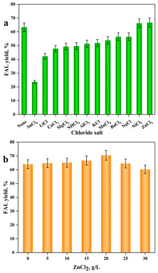 Effect of different chloride salts (15 g/L) on the FAL yield (xylose-rich hydrolysate containing 20 g/L xylose, 3.6 wt.% SO42−/SnO2-FFS, DESMLA–water system (1:9, v/v), 170 °C, 15 min, 500 rpm) (a); effect of ZnCl2 dosage (0–30 g/L) on the FAL yield (xylose-rich hydrolysate containing 20 g/L xylose, 3.6 wt.% SO42−/SnO2-FFS, DESMLA–water system (1:9, v/v), 170 °C, 15 min, 500 rpm) (b).
