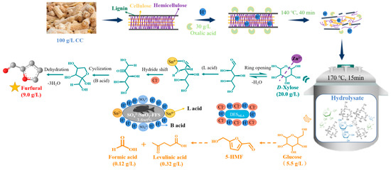 The continued use of non-renewable energy has raised people’s awareness of natural resource depletion and global warming, shifting the focus of many countries to renewable energy [1,2]. It is known that lignocellulosic biomass (LB) is renewable and eco-friendly [3,4,5], which is considered a replacement for manufacture biofuels, materials, and high-value biobased compounds because it is plentiful, inexpensive, and promising [6,7,8,9,10]. As one of the important chemical intermediates, furfural (FAL) can be transformed from lignocellulose or its derivatives (e.g., xylan and D-xylose) via hydrothermal reaction [11]. In industrial production, FAL has been widely used. It has become a raw material for pharmaceuticals, industrial solvents, and numerous fuel additives [12]. By deeper processing, it can be transformed into various furan-based compounds (e.g., tetrahydrofuran, furoic acid, tetrahydrofuran, dihydropyran, acetyl furan, furfuryl alcohol, and furfurylamine) [13].