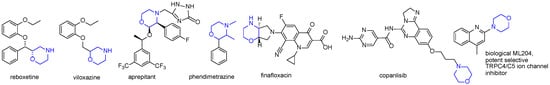 Morpholine is considered a favored scaffold for medicinal chemistry [1,2,3,4,5,6]. Synthetic and natural molecules bearing a morpholine substituent have multiple biological activities, as well as improved pharmacokinetic and metabolic profiles, which have placed morpholine as one of the most promising compounds evaluated in structure–activity relationship studies (Figure 1). The advantage of morpholine over other nitrogen-containing heterocycles is its electron-deficient ring due to the negative influence of oxygen, as well as the relatively lower basicity of nitrogen.