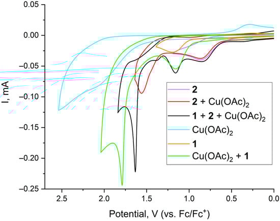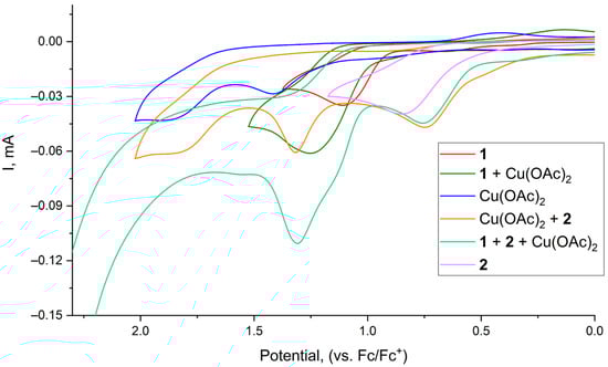 CV of quinoline N-oxide (1), morpholine (2), Cu(OAc)2, and their mixtures in CH3CN. Bu4NBF4 0.1 M; CH3CN; working/auxiliary electrode—Pt/Pt; all compounds 5 × 10−3 M concentration; 100 mV/s; Ag/AgNO3 as reference electrode (recalculated against Fc/Fc+).