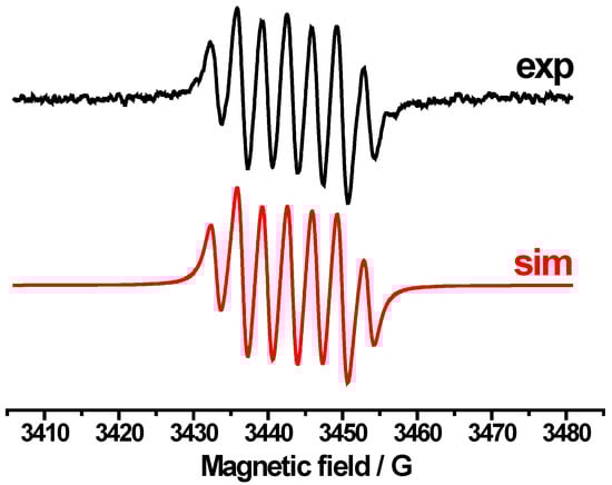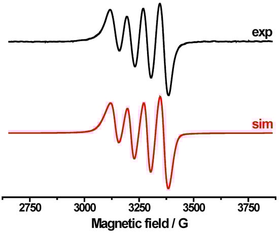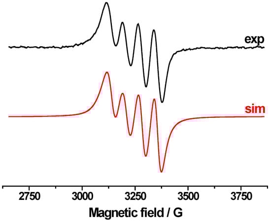 EPR spectrum registered during morpholine (2) and Cu(OAc)2 oxidation with 5 × 10−3 M concentration of both compounds; CH3CN, 0.1 M Bu4NBF4, rt. g = 2.129, aCu = 72 G, <∆H> = 39 G (CH3CN).