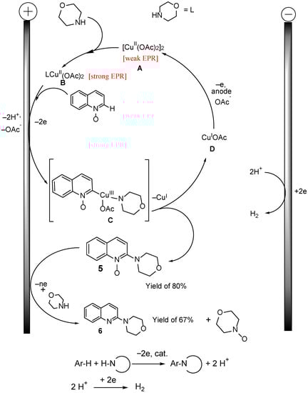 Since morpholine radicals are not observed in acetonitrile, the mechanism must be different. The stage of copper acetate monomerization in the presence of morpholine is followed by the oxidation of a mixture of cross-coupling precursors and a copper catalyst, as can be assumed, with the formation of CuIII, and then the reductive elimination stage leads to the formation of a C–N product of ortho-substitution in N-oxide, and CuI is further oxidized at the anode, and the cycle closes.