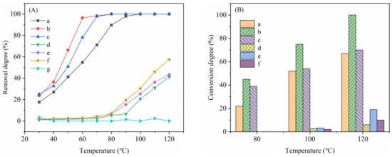 HCHO removal degree (A) and conversion degree (B) of 10Mn/Mg1Al1-LDH (a), 10Mn/Mg3Al1-LDH (b), 10Mn/Mg5Al1-LDH (c), Mg1Al1-LDH (d), Mg3Al1-LDH (e), Mg5Al1-LDH (f) and blank (g), when GHSV = 50,000 h−1, and RH = 60 ± 3%.