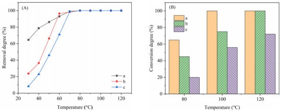 Effect of Mn loading on HCHO removal (A) and conversion (B) by 20Mn/Mg3Al1-LDH (a), 10Mn/Mg3Al1-LDH (b) and 5Mn/Mg3Al1-LDH (c), when GHSV = 50,000 h−1, and RH = 60 ± 3%.