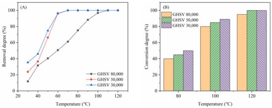 Effect of GHSV on HCHO removal degree (A) and conversion degree (B) by 10Mn/Mg3Al1-LDH catalyst, when RH = 60 ± 3%.