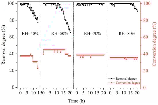 Effect of relative humidity on HCHO removal and conversion by 10Mn/Mg3Al1-LDH catalyst, at 80°C, and when GHSV = 50,000 h−1.