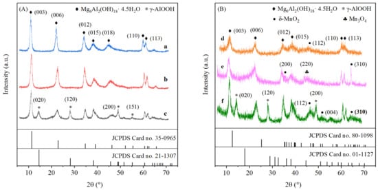 XRD patterns of Mg5Al1-LDH (a), Mg3Al1-LDH (b), Mg1Al1-LDH (c), 10Mn/Mg5Al1-LDH (d), 10Mn/Mg3Al1-LDH (e), and 10Mn/Mg1Al1- LDH (f). The standard XRD patterns of Mg6Al2(OH)18·4.5H2O (35-0965), γ-AlOOH (21-1307), δ-MnO2 (80-1098) and Mn3O4 (01-1127) are also shown in the subfigures.