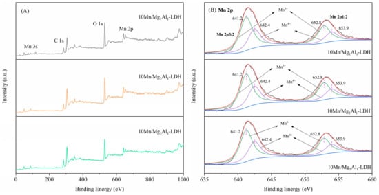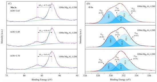 The chemical state of surface elements of 10Mn/MgAl-LDH catalysts was analyzed by XPS. The recorded spectra are shown in Figure 6 and the quantitative results are listed in Table 2. Figure 6A shows the overall scanning spectra. Figure 6B shows the Mn 2p spectra, which is further fitted into two sets of peaks as (641.1 eV and 652.8 eV as one set, while 642.4 eV and 553.9 eV as another set) corresponding to Mn3+ and Mn4+, respectively [,]. The 10Mn/Mg3Al1-LDH catalyst had the highest Mn4+/Mn3+ (0.75), followed by 10Mn/Mg5Al1-LDH (0.66), while the 10Mn/Mg1Al1-LDH catalyst had the lowest Mn4+/Mn3+ (0.51). This phenomenon suggests that the presence of more Mn4+ species on the surface of 10Mn/Mg3Al1-LDH provides a large number of reactive sites for formaldehyde oxidation. The average oxidation state (AOS) [] of Mn was calculated using the empirical formula AOS = 8.956–1.126ΔE3s (ΔE3s, the difference of splitting energy level in Mn3s spectra) based on Mn 3s spectra (Figure 6C). As shown in Table 2, the AOS of 10Mn/Mg3Al1-LDH (3.89) is higher than that of 10Mn/Mg5Al1-LDH (3.70) and 10Mn/Mg1Al1-LDH (3.65), further revealing that there is a significant amount of Mn4+/Mn3+ in the 10Mn/Mg3Al1-LDH catalyst. This is consistent with the Mn 2p2/3 orbital XPS results. As reported in the literature [], a large amount of Mn4+ can provide sufficient reactive sites for the catalytic oxidation of formaldehyde.