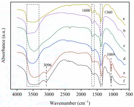 FTIR patterns of Mg5Al1-LDH (a), Mg3Al1-LDH (b), Mg1Al1-LDH (c), 10Mn/Mg5Al1-LDH (d), 10Mn/Mg3Al1-LDH (e), and 10Mn/Mg1Al1-LDH (f).