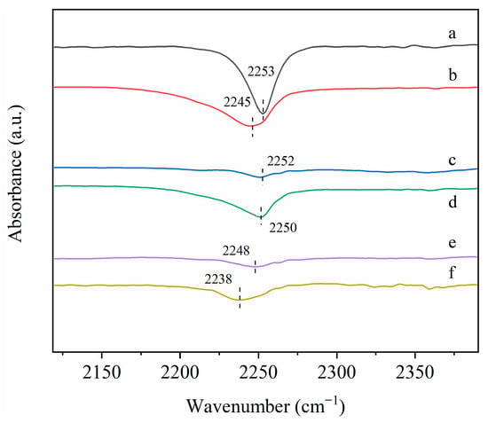 In situ CDCl3 FTIR patterns of Mg1Al1-LDH (a), 10Mn/Mg1Al1-LDH (b), Mg3Al1-LDH (c), 10Mn/Mg3Al1-LDH (d), Mg5Al1-LDH (e), and 10Mn/Mg5Al1-LDH (f).