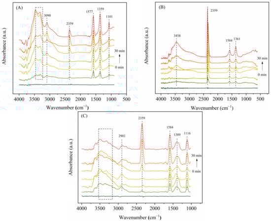 In situ FITR spectra of 10Mn/Mg1Al1-LDH (A), 10Mn/Mg3Al1-LDH (B) and 10Mn/Mg5Al1-LDH (C) during formaldehyde oxidation process.