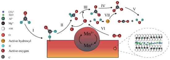 Based on the results of the intermediate product analysis of formaldehyde for the 10Mn/Mg1Al1-LDH, 10Mn/Mg3Al1-LDH and 10Mn/Mg5Al1-LDH catalysts, a possible pathway to the conversion of formaldehyde is proposed in Figure 10. Firstly, the oxygen molecules in the air are adsorbed by the active site and decomposed to form surface active oxygen (O−, O2−) (VI), which oxidizes the Mn3+ in MnOx into Mn4+. Additionally, surface active oxygen (O−, O2−) can be combined with water molecules to form active hydroxyl groups (OH*) (VII). Meanwhile, formaldehyde is adsorbed on the catalyst surface (I) by a large number of hydroxyl groups on the hydrotalcites surface. It is then converted into DOM (II) by the nucleophilic attack of surface active oxygen species, followed by the further conversion of DOM into the stable intermediate formates (III). The formates then react with surface reactive oxygen and reactive hydroxyl groups to form the carbonate (IV) further oxidized into CO2 and water (V). Meanwhile, Mn4+ is reduced to Mn3+ by hydrocarbons. The effective reaction occurring between oxygen molecules in the air and the active sites of the catalyst continuously replenishes the depleted surface active oxygen for formaldehyde oxidation. The low-temperature asynchronous conversion of formaldehyde results in the accumulation of some intermediates on the catalyst surface covering the active center, thus resulting in catalyst deactivation.